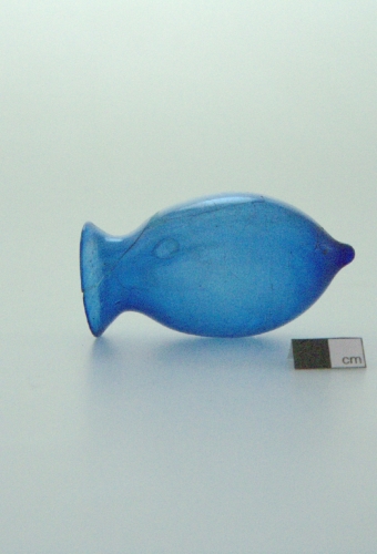 labbro esoverso con orlo arrotondato; collo imbutiforme; ventre ovoidale terminante a punta. Vetro blu, trasparente.