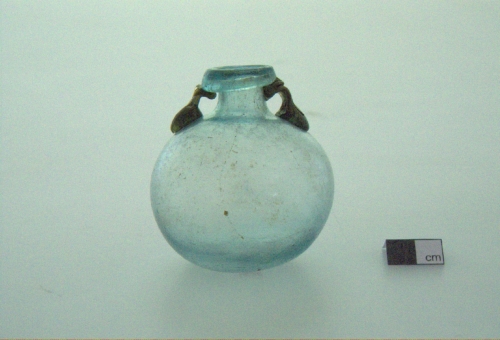 labbro realizzato con una doppia ribattitura, verso l'alto e verso il basso, a collarino; breve collo cilindrico; ventre sferoidale; fondo piatto. Sotto il labbro sono saldate le due anse delfiniformi impostate sulla spalla, modellate a parte e applicate a caldo. Vetro azzurro chiaro, trasparente; anse di colore verde chiaro, trasparente.