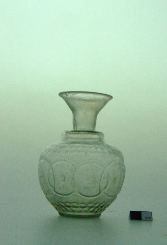orlo tagliato e levigato;labbro estroflesso; collo cilindrico con incavo alla base; spalla arrotondata; corpo globulare decorato da una fascia centrale a cerchi intersecantisi con sepressione circolare al centro , compresa tra due fasce a doppia fila di depressioni circolari; piccolo piede leggermente concavo e appena sagomato.Vetro incolore, trasparente. Labbro e collo soffiati liberamente a parte e inseriti a caldo.