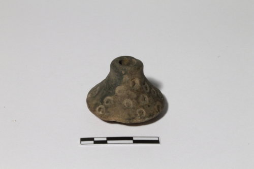 Il reperto presenta un corpo a profilo conico, con la base piana leggermente convessa e la parte superiore cilindrica. Il reperto è attraversato in posizione centrale da un foro circolare passante. la superficie esterna è caratterizzata da un decoro a "occhi di dado".