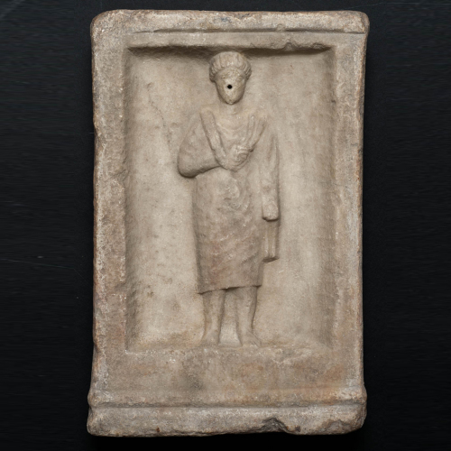 Il rilievo è stato realizzato entro un campo di forma rettangolare, dal fondo liscio. In esso si trova una figura maschile stante, vestita di una lunga toga. La mano destra è portata al petto mentre la sinistra è stesa lungo il corpo. Sul volto si nota un enorme foro che ne compromette la lettura.