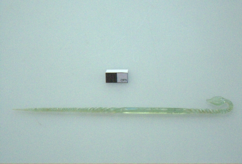 corpo con un'estremità ripiegata terminante a foglia e l'altra appuntita,variamente lavorato:a sezione circolare a torciglione, a sezione quadrangolare senza nessuna lavorazione e di nuovo a sezione circolare a torciglione. Vetro verde, trasparente.