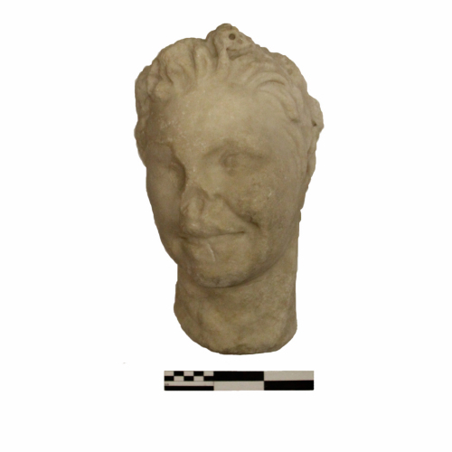 La testa ritrae una figura dall'aspetto allegro e vivace: il volto, dall'ovale morbido, è caratterizzato da un'ampia fronte triangolare, da grandi occhi appena ombreggiati dalle soppracciglia sottili dalla forma arcuata. Il naso è abraso. La bocca, dalle labbra carnose, è piegata in un sorriso scherzoso. I capelli sono costituiti da ciocche che si dispongono a fiamma attorno alla fronte, lasciando però libere le orecchie a punta, qui solo appena percepibili.