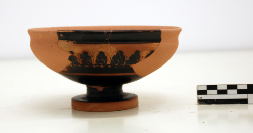 Coppa skyphoide con orlo distinto leggermente estroflesso, vasca profonda, piede a disco con largo e corto stelo, che presenta tracce della tornitura. Sulla superficie esterna: fascia di palmette e boccioli allungati su catena di circoli con punto centrale, con particolari incisi e sovradipinti in bianco e paonazzo, ora evanidi. Sul piede, in corrispondenza della costa e sotto di esso, fascia risparmiata. Decorazione di base e interno del piede, a vernice nera. Sulla superficie interna, sotto l'orlo, filetto risparmiato; sul fondo, tondo con punto e anello a vernice.
