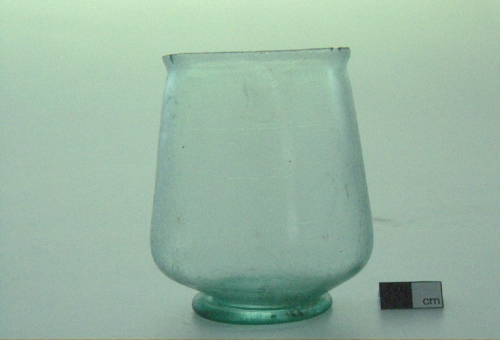 labbro estroflesso con orlo tagliato e levigato;corpo carenato a sacco, decorato da incisioni anulari realizzate a ruota; fondo con piede a disco applicato. Vetro azzurro, trasparente.