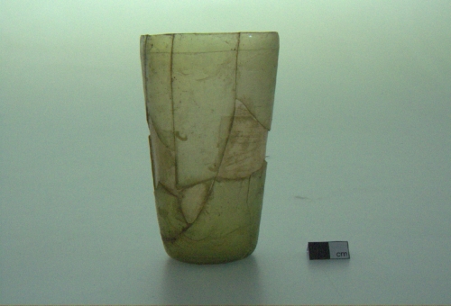 orlo leggermente rientrante, tagliato a spigolo vivo;corpo cilindrico decorato da una linea incisa sotto l'orlo; fondo piatto. Vetro incolore, trasparente.