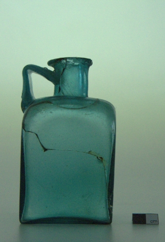 labbro estroflesso, ingrossato e appiattito; breve collo cilindrico, leggermente strozzato alla base; corpo parallelepipedo a sezione quadrangolare; fondo piatto con tre cerchi concentrici in rilievo. Ansa a piccole nervature, fusa a parte e applicata a caldo, impostata sulla spalla e fissata sul collo. Vetro azzurro, trasparente.