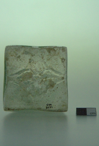 labbro con doppia ribattitura, all'esteno e all'interno e appiattito; collo cilindrico; spalla smussata; corpo parallelepipedo a sezione quadrangolare; fondo piatto con marchio in rilievo costituito da un fiore a quattro petali. Ansa tricostolata, fusa a parte e applicata a caldo, impostata sulla spalla e fissata sotto l'orlo. Vetro verdeazzurro, trasparente.