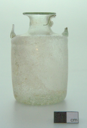 labbro estroflesso e appiattito; breve collo cilindrico; spalla smussata; corpo corpo cilindrico; fondo piatto. Ansette fuse a parte e applicate a caldo, impostate sulla spalla e fissate al collo. Vetro incolore, trasparente.