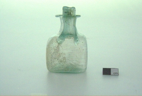 labbro estroflesso e ripiegato all'interno a cordoncino; breve collo cilindrico; spalla arrotondata; corpo cubico; fondo piano. Ansa bicostolata fusa a parte e applicata a caldo, impostata sulla spalla e fissata all'orlo, con un'apofisi. Vetro verdeazzurro, trasparente.