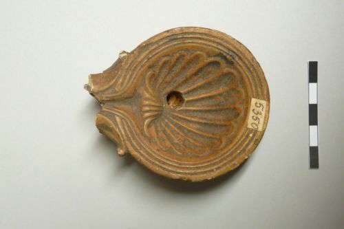 volute doppie e canale aperto; disco leggermente concavo decorato da valva di conchiglia di forma circolare con 14 coste concave e umbone compatto arrotondato, foro di alimentazione leggermente decentrato; spalla solcata da tre circonferenze concentriche e quattro cordoli; decorazione della spalla interrotta all'altezza del becco da una piccola lingua sulla quale è aperto un piccolissimo foro di sfiato; base piatta