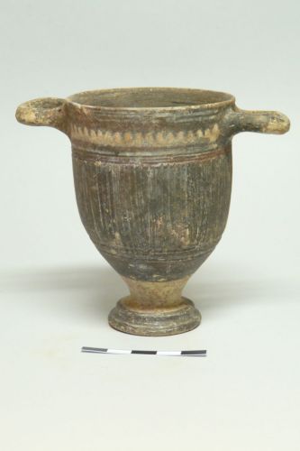 - NOTIZIE STORICO CRITICHE lo skyphos si inserisce nella cosiddetta Late Canosan, una produzione caratteristica forse di un unica fabbrica o di un unico gruppo; gli scavi della necropoli di Martvilo a Vis hanno restituito una grandissima quantità di ceramica di Gnathia e molta proprio di questa produzione
