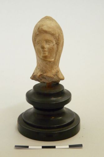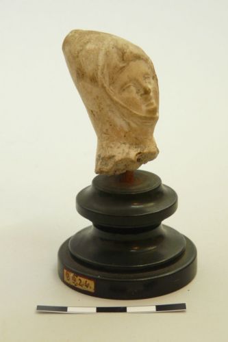 testina femminile leggermente inclinata verso sinistra, dai tratti del volto resi naturalisticamente. La bocca è chiusa. Il mantello è fatto passare sul capo e piuttosto avanti sulle guance e sotto il mento in modo da coprire parte del volto. Impasto beige rosato molto depurato