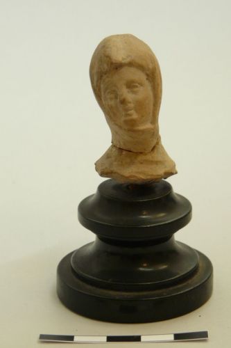 testina femminile leggermente inclinata verso sinistra, dai tratti del volto resi naturalisticamente; la bocca è chiusa; il mantello è fatto passare sul capo e piuttosto avanti sulle guance e sotto il mento in modo da coprire parte del volto. Impasto beige rosato