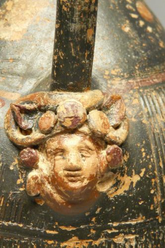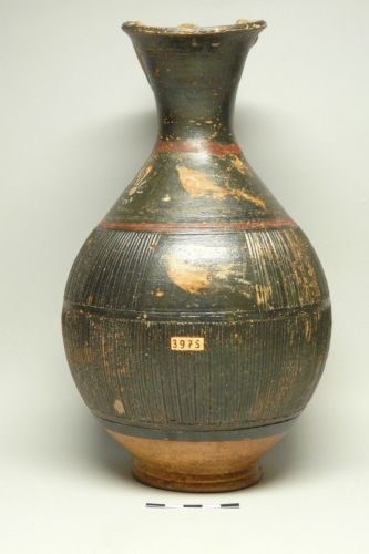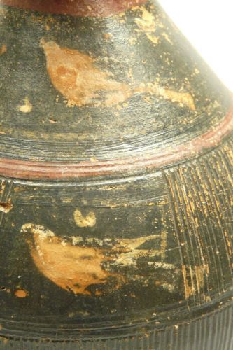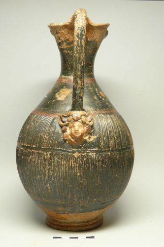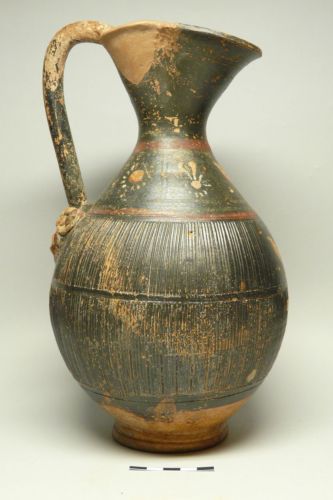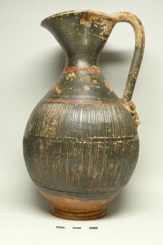 - NOTIZIE STORICO CRITICHE l'oinochoe si inserisce probabilmente in una produzione locale di ceramica di Gnathia, nota anche grazie alle fornaci trovate sull'isola nella prima metà del XX secolo; si tratta di una produzione che deriva dalla Late Canosan, da cui però poi si discosta per morfologia e sintassi decorativa e si caratterizza soprattutto per la combinazione di decorazioni incise e dipinte, in particolare in una serie di oinochai alti e con il collo stretto