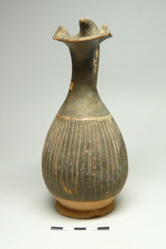 orlo trilobato con doppia solcatura vicino al margine interno, lungo collo cilindrico, corpo ovoide, basso piede ad anello con base d'appoggio piana; ansa a bastoncello a sezione circolare con appendice conica all'attacco dell'orlo; impostata inferiormente sopra la massima espansione. Corpo decorato a baccellature; tracce della decorazione dipinta al di sopra delle baccellature e all'attacco inferiore dell'ansa, dove rimane una serie di petali