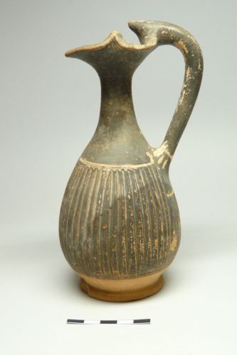 - NOTIZIE STORICO CRITICHE l'oinochoe si inserisce probabilmente in una produzione locale di ceramica di Gnathia, nota anche grazie alle fornaci trovate sull'isola nella prima metà del XX secolo; si tratta di una produzione che deriva dalla Late Canosan, da cui però poi si discosta per morfologia e sintassi decorativa e si caratterizza soprattutto per la combinazione di decorazioni incise e dipinte, in particolare in una serie di oinochai alti e con il collo stretto