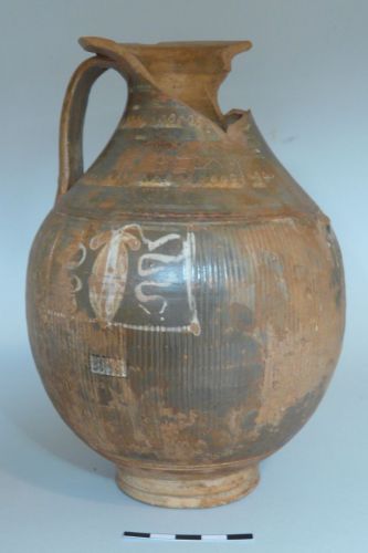 ampio orlo a tesa, piatto superiormente; breve collo imbutiforme, corpo ovoide con alto piede ad anello dal profilo esterno sagomato; anse a nastro impostate sotto l'orlo e all'inizio della massima espansione. Sul collo sovradipinte una riga bianca, una rossa, una bianca, una fascia di lineette bianche verticali parallele, una riga bianca, una rossa, una fascia di lineette verticali parallele presso l'attacco inferiore delle anse (tra le quali corrono due scanalature parallele). Il corpo è interamente decorato da fitte scanalature parallele verticali chiuse inferiormente da altre due scanalature orizzontali. Da un lato vi è un riquadro sovradipinto in bianco, campito con un elemento ovale centrale affiancato e trattenuto da due tenie