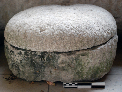 Urna cilindrica con corpo basso e coperchio emisferico. Il corpo è lavorato a scalpello, il coperchio a gradina.