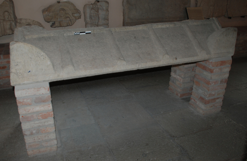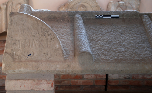 Coperchio di sarcofago a doppio spiovente con acroteri angolari; su ciascuno degli acroteri anteriori un'iscrizione su due righe in lettere greche.
