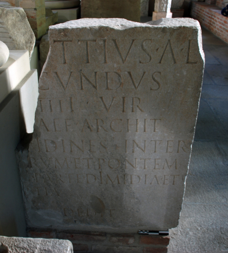 - ISCRIZIONI sullo specchio epigrafico - A(ulus) Bruttius A(uli) l(ibertus) / Secundus / (sex)vir / praef(ectus) archit(ectus ?) / crepidines inter / murum et pontem / pro parte dimidia et / tertia / dedit - lettere capitali - a incisione - latino