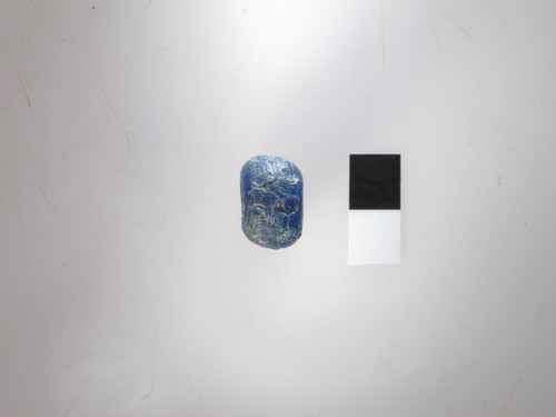 Perla tondeggiante medio-grande in pasta vitrea azzurra con decorazione a zig-zag saltata. Tipo D Gambacurta, G. 1987: "perle con decorazione a zig-zag".