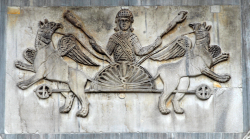 Bassorilievo con la raffigurazione di un personaggio maschile, ritratto in posizione frontale e stante sopra un carro; indossa una tunica manicata, coperta da due bande incrociate, con una mitra regale sul capo; ha le braccia aperte, simmetriche, intento a reggere due pertiche con le prede infilzate sulle punte. Al carro sono aggiogati due animali fantastici, che hanno il corpo di leone, ma la testa e ali di grifo; questi sono raffigurati di profilo, in posizione araldica con lo sguardo retrospiciente, in direzione delle prede. La veste e la tiara della figura maschile è costellata di fori, in cui dovevano essere incastonate pietre preziose.