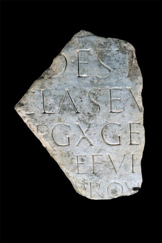 - ISCRIZIONI all'interno dello specchio epigrafico - [T(ito) Dest[icio T(iti) f(ilio)] / Cla(udia tribu) Sev[ero, p(rimo) p(ilo)]/ [l]eg(ionis) X Ge[m(inae), sub-] / [pra]ef(ecto) vi[gil(um), proc(uratori)] / [Aug(usti)] prov(inciae)[Daciae] / ----------------- - lettere capitali - a incisione - latino