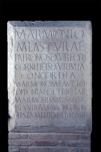 - ISCRIZIONI all'interno dello specchio epigrafico - M(arco) Armonio / M(arci) l(iberto) Astrae, / patrono, sexvir(o). Foro / Corneli et sexvir(o) Iulia / Concordia, / M(arcus) Armon(i)o M(arci) l(iberto) Aucto, / Opponiai C(ai) l(ibernai) Tertiai, / M(arcus) Armonium M(arci) l(ibertus) Salvius, / sexvir Iulia Concordia, / testamento fieri iussit. - lettere capitali - a incisione - latino