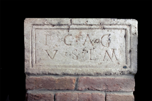 - ISCRIZIONI all'interno dello specchio epigrafico - P. G. A. G. / V(otum) s(olvit) l(ibens) m(erito) - lettere capitali - a incisione - latino