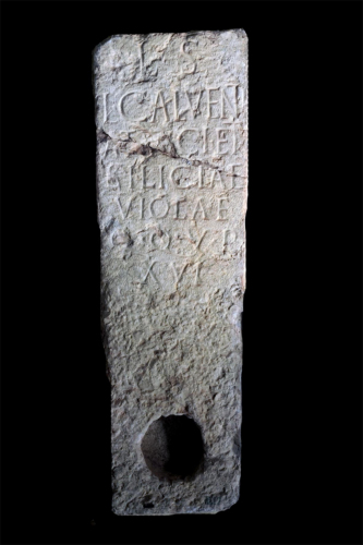 - ISCRIZIONI all'interno dello specchio epigrafico - L(ocus) s(epulturae) / L(uci) Calvent(i) / Attici et / Siliciae / Violae / Q(uo)q(uo)v(ersus) p(edes) / (sedecim) - lettere capitali - a incisione - latino