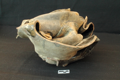 Scarto di fornace, nel quale è possibile riconoscere almento quattro ollette monoansate, tipologicamente riconducibili ai tipi della ceramica invetriata monocroma, fuse insieme in fase di cottura.