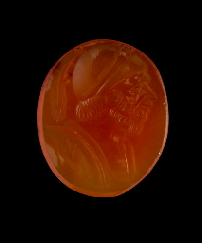Corniola rossa scura di forma ovale piana/piana con inciso busto di guerriero barbato di profilo a destra, con armatura ed elmo. Da notare l'elmo, a calotta liscia, con piuma che scende all'indietro fino alla spalla. Il profilo è segnato dalla fronte prominente, dal naso allungato e dalla bocca (visibile al di sopra della barba e resa tramite due brevi tratti paralleli). La barba è rappresentata da due file di riccioli.