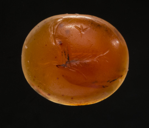 Corniola di forma ovale convessa/piana (forma 2?) su cui è inciso un capricorno rivolto verso sinistra, sopra il quale è raffigurata una stella; la coda di pesce, segnata da piccoli tratti disposti in diagonale, è semplicemente diritta; le corna sulla piccola testa sono rivolte verso l'alto e sono incise molto superficialmente (difficilmente leggibili).
