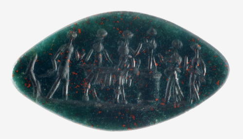 Diaspro verde di forma ogivale piana/piana con incisa una scena di sacrificio. La composizione è distribuita in senso orizzontale: cinque personaggi stanti sono allineati paratatticamente su una lunga linea del suolo; tre a sinistra di un altare (ara circolare sagomata) con statua di divinità (probabilmente femminile), rivolti verso destra, sono intenti a condurre un capro; mentre i due a destra dell'ara, sono rivolti verso sinistra (la figura più vicina all'ara è un personaggio femminile in veste lunga, forse una sacerdotessa); sulla sinistra la composizione è chiusa da un elemento stilizzato, che rappresenta un albero. Lo stile è corsivo e la resa abbastanza schematica, ma non manca di vivacità e di cura dei dettagli.