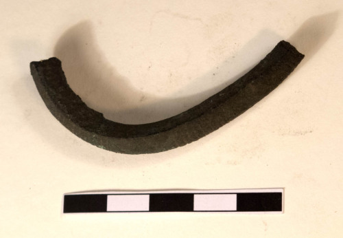 Bracciale (armilla) realizzato in verga di bronzo a sezione romboidale. L'intero corpo è decorato da sottili incisioni parallele, interrotte da linee oblique che si incrociano a formare una x. La decorazione si estendeva fino alle due estremità sovrapposte.