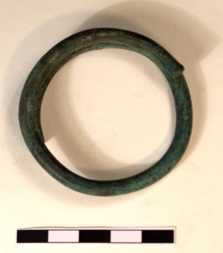 Bracciale (armilla) a spirale, coi capi sovrapposti realizzato in verga di bronzo a sezione circolare. L'intero corpo è a sezione circiolare. I capi sono sovrapposti per la metà della circonferenza.
