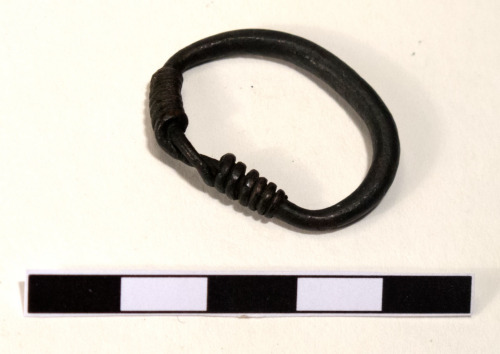 Anello digitale, a verga a sezione circolare, annodato e decorato da due sottili fili di metallo attorcigliati con 6 spire da ogni lato del nodo.