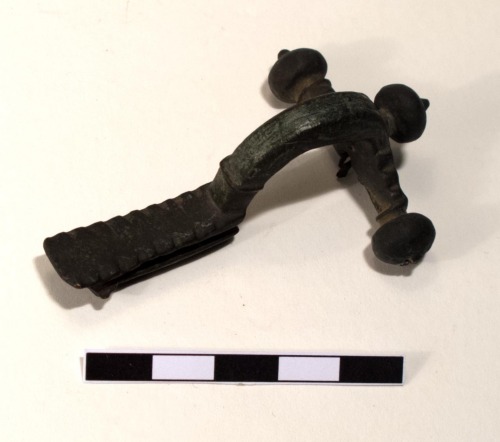Fibula a cerniera, del tipo a croce latina con globetti a "cipolla" posti all'estremità del braccio della cerniera, terminanti con un bottoncino rilevato. I bracci della cerniera sono decorati con due impressioni. Un ulteriore globetto è posto alla testa dell'arco. La staffa fa angolo con l'arco a semicerchio, ed è decorata da impressioni. Manca l'ardiglione.
