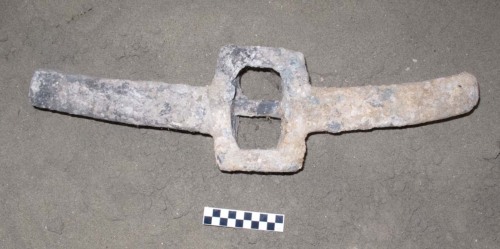 Ceppo d'ancora di tipo fisso di piccole dimensioni con braccia a fusione piena. Presenta il perno di fissaggio in piombo posto al centro della scassa. Il perno risulta essere già stato rotto in antico. La struttura evidenzia il tipo di costruzione avvenuta per fusione completa del ceppo: i bracci presentano una differenza di lunghezza tra la faccia superiore e quella inferiore di 6/3 cm.