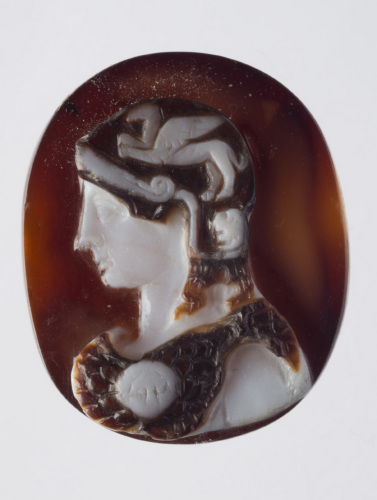 Sul fondo scuro, si staglia in bianco opaco il profilo di Atena Parthenos, volto verso sinistra e reso in maniera abbastanza imprecisa. Il naso è diritto, l'occhio grande, con la palpebra pesante, le labbra leggermente schiuse e il mento arrotondato. La testa della dea è ricoperta da un elmo riccamente ornato: sul casco si vede un cavallo o leone alato in atto di saltare (la testa è piccola, ma zampe e coda sono di leone); dal paranuca decorato da una testa di leone si distaccano due ciocche di capelli ondulati, una sulla schiena, una lungo il collo. Il busto è ricoperto dall'egida, ricavata su uno strato scuro, al cui centro spicca un gorgoneion bianco, rappresentato di prospetto