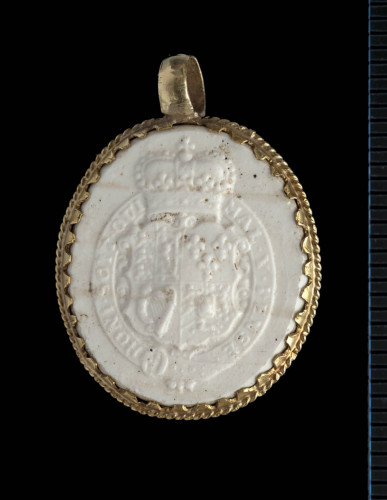 Cammeo in vetro, con raffigurazioni su entrambi i lati, legato in castone d'argento dorato con bordo a catena, con anello per la sospensione in alto. A: Busto di re Giorgio I d'Inghilterra e di Hannover (1660-1727), di profilo verso destra, tagliato sotto le spalle (da notare la ricca parrucca che scende sulle spalle con ampie ondulazioni e l'abito sfarzoso) B: Stemma del re, sormontato dalla corona e circondato da un'iscrizione (motto dell'Ordine della Giarrettiera)