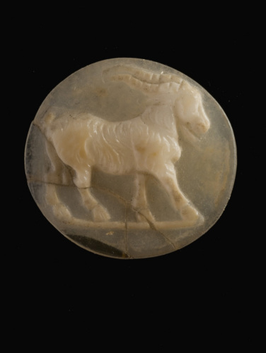 Sul fondo traslucido si staglia in bianco opaco la figura di un capride, raffigurato di profilo, in atto di avanzare verso destra su una lunga linea del suolo. L'animale è caratterizzato dalle lunghe corna all'indietro (ondulate e decorate da trattini paralleli) e dal pelo reso con sottili linee incise, dall'andamento sinuoso.