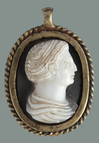 Cammeo legato in castone d'argento dorato con bordo a maglie intrecciate, con anello per la sospensione in alto. Busto femminile con testa di profilo a destra, tagliato sotto le spalle. Caratteristici i tratti del volto: fronte alta, naso aquilino, occhio dalle palpebre segnate, bocca e mento piccoli. L'acconciatura, è resa a ciocche parallele che si raccolgono in una treccia sulla nuca, lasciando scoperto l'orecchio. Attorno al collo robusto sono indicate le corpose pieghe della veste.