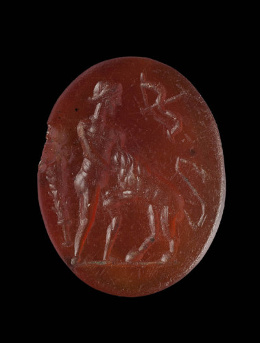 - NOTIZIE STORICO CRITICHE La gemma, di cui è andato perduto il rapporto con la collezione di appartenenza, confluisce nella collezione Marciana a partire dal XVI secolo. L'immagine raffigurata ha una lunghissima tradizione iconografica, che comincia in Grecia, in età arcaica, ed è uno dei soggetti della saga erculea più diffusi nella glittica, probabilmente per il suo valore di amuleto: Ercole con il leone, raffigurato su pietre di colore rosso, serve infatti a proteggere dalle coliche (sul tema si veda Faraone 2011, pp. 52-54)