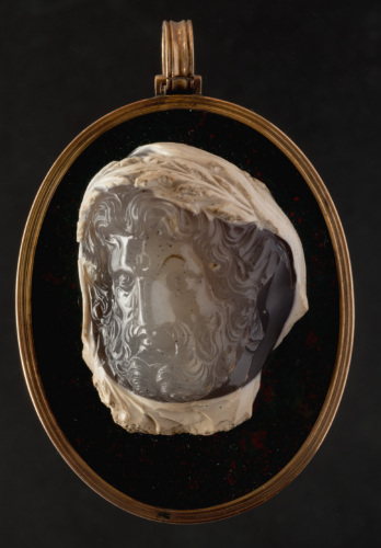 Cammeo con testa di Giove coronato di quercia e velato, lavorato ad altorilievo. Il pezzo, fissato su una base di diaspro sanguigno, è legato in una cornice dorata, con anello per la sospensione in alto, del XVIII secolo. Il dio è raffigurato di tre-quarti verso sinistra, con il volto leggermente inclinato verso il basso. I capelli ondulati si dividono al centro in due ampie ciocche sollevate sulla fronte e ricadono ai lati del volto, nascondendo le orecchi. La barba è corta e bipartita. Gli occhi presentano iride e pupilla incisa. Sui capelli è posata una corona di foglie di quercia; la testa è velata da un manto, che scende fin sotto il mento. Entrambi questi elementi, corona e manto, sono ricavati nello strato opaco della pietra, mentre lo strato traslucido è stato sfruttata per raffigurare il volto, la barba e la chioma.