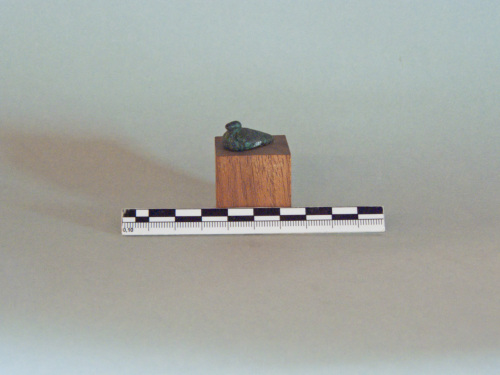 Il bronzetto rappresenta un volatile forse un'anatra accovacciata, si individua il becco, sul corpo dell'animale - a profilo allungato - si individua il piumaggio reso a a incisione.Nella parte inferiore presenta incavo a profilo subrettangolare, probabilmente punto di innesto.