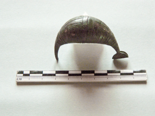 fibula a sanguisuga, l'arco è decorato ad incisione con motivi a meandro inornati alternati a campiti da tratti obliqui, staffa corta; priva della molla e dell'ago.