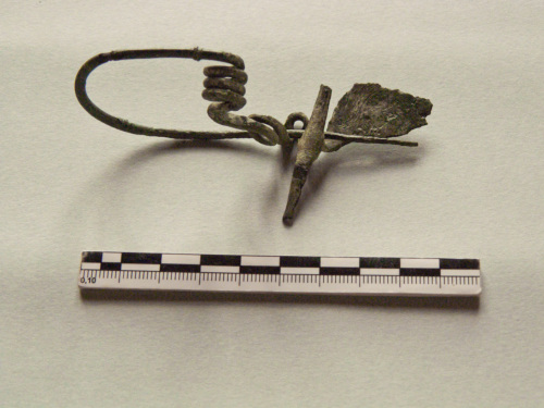 Frammento di fibula ad arco serpeggiante in verga sottile e grande staffa in lamina; priva di ago.