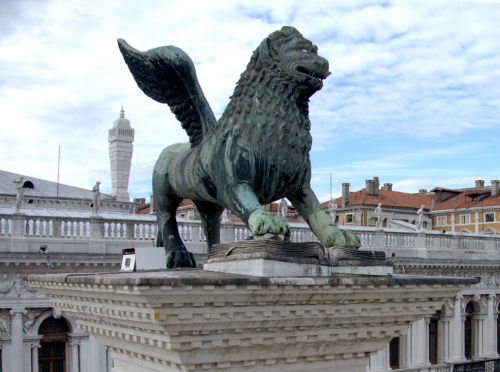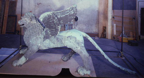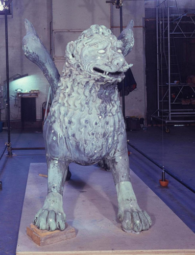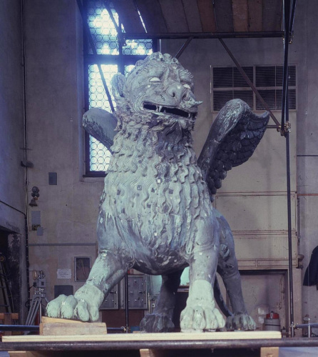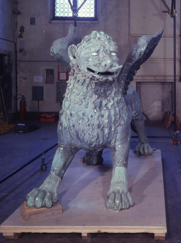 - NOTIZIE STORICO CRITICHE La più antica menzione è del 1293, quando però si parla già di restauri; e poiché la colonna sulla quale si trova fu portata a Venezia nel 1172, tra queste due date (metà del XIII sec. circa) va posta la collocazione del leone. Fu asportato da Napoleone che lo collocò a Parigi nella Place des Invalides, e tornò a Venezia nel 1815; in questa occasione cadde, si ruppe in molti pezzi e fu restaurato dallo scultore Bartolomeo Ferrari, il quale lo ricompose con orditure di ferro e borchie a testa quadrata. Fu rimosso nel 1892 per una completa ispezione da G. Boni e poi non fu più toccato fino al 1940, quando fu posto al sicuro in occasione della seconda guerra mondiale. Le integrazioni del Ferrari (coda, ali, parte delle zampe e un ciuffo sulla testa), sono chiaramente riconoscibili; il libro sotto le zampe fu rifatto in piombo, ma la figura, specie la testa il petto e i fianchi, è sostanzialmente originale e in buone condizioni. Un serio elemento di dubbio è costituito dalle ali: le attuali si devono senz'altro al restauro del Ferrari, che ha sostituito quelle medievali, ma non è certo se la bestia fosse originariamente alata, prima di essere trasformata nel simbolo di S. Marco. Fu creduto romanico, assiro, indiano, cinese e sassanide. Un punto fermo è dato dal fatto che esso è certo anteriore alla metà del XIII sec. (la più bassa data possibile), ma per ragioni stilistiche e tecniche non può certo essere considerato opera medievale italiana; c'è ragione di credere invece che, come altre antichità veneziane, provenga da Costantinopoli o dal Levante. L'ipotesi che in origine si trattasse di una Chimera è molto verosimile.